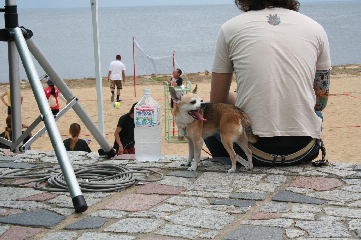 昨日は海の日でしたね。ウチから近くの浜宮という海岸でビーチバレー大会と1日海の家というイベントがあっていて、tonoが音響の仕事で行っていたので、私と2チーも出かけてみました。うす曇りだったけど、すごい暑さ!!しかもチビッ子がいっぱいで熱烈なセンレイを受けた2チーはスカサズ退散となりました