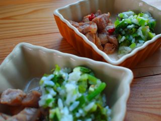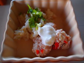 細かく刻んだピーマンとキャベツをミンチと一緒に鶏団子にしました。