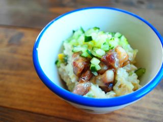 休日前に作っておいた鶏おじやに、庭で採れた野菜をプラスして。