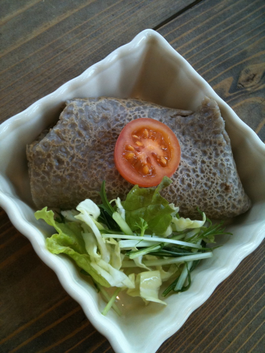 ・焼き上がった生地に具を巻いて、サラダ、飾り用ミニトマトと盛りつけて、出来上がり。