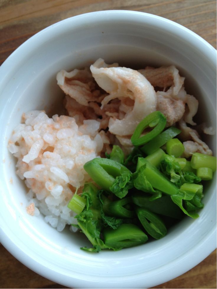 スナップエンドウと菜の花のボイルを添え、お肉を煮込んだスープでゴハンをおじやにしたものとで盛り付けました。
