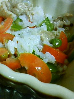 トマトと豚肉のリゾット風(豚こま肉、プチトマト(アイコ)ピーマン、さやえんどう、昆布出汁)