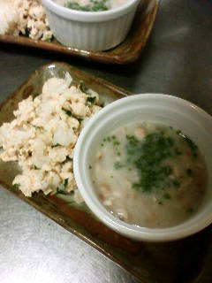 ②昆布出汁でおじやを作り、おからPをあわせる
