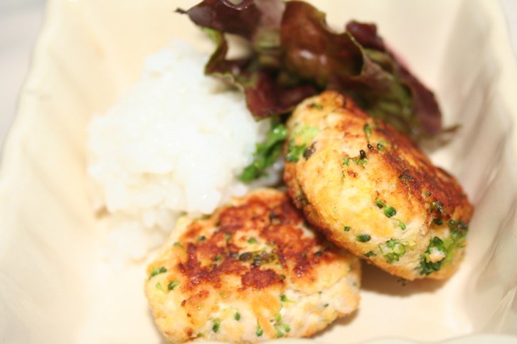 ②ブロッコリーと人参をFPにかけ、おからP、生姜のすりおろしと共に鶏ミンチに混ぜたらよく捏ねて、エクストラバージンオリーブオイルで美味しそうな焼きめが付くまで焼き、裏返して弱火にしたら蓋をして、じっくりといい色になるまで焼く。