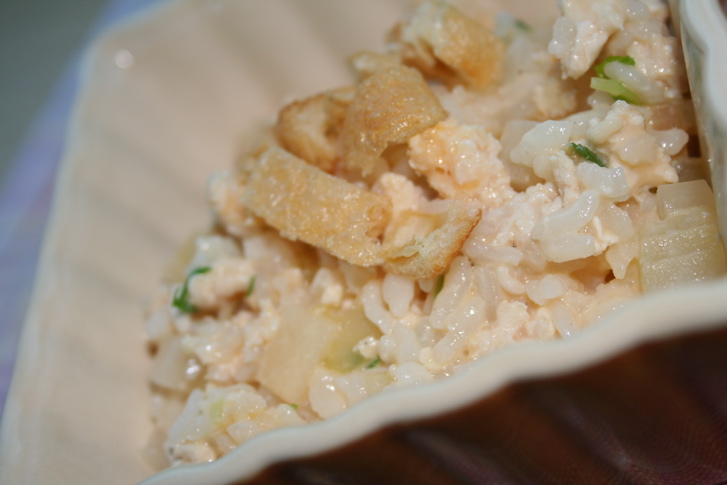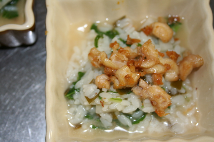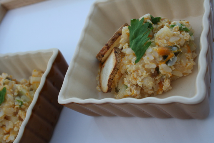 ③白米を加え、卵黄、豆乳を入れさっとひと煮立ちして、テフロン加工のフライパンで油を使わずに焼いた油揚げをトッピングして、出来上がり。