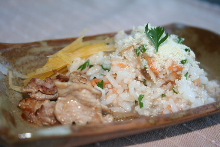 今日は、キノコが入ったし、上にふりかけたオカラがさも、パルメザンのようだったので、「リゾット」と言ってみたかったのです。