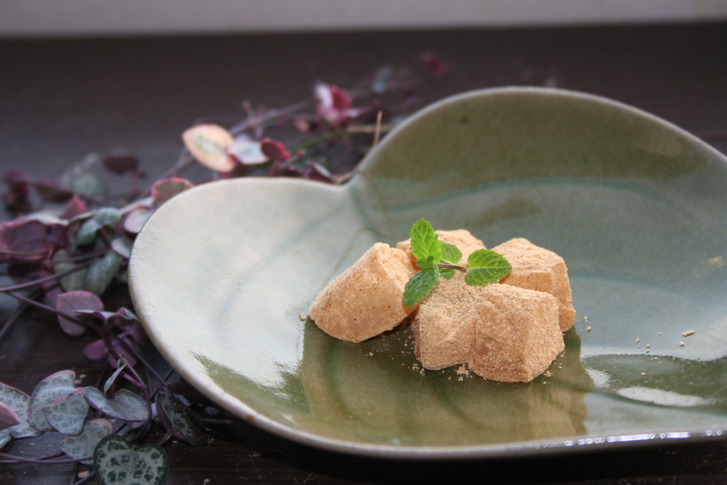葛練り(無糖(今回は葛粉大さじ2にお水110㎖)を作って冷蔵庫で冷やし、きな粉(これまた無糖)をまぶしたものです。