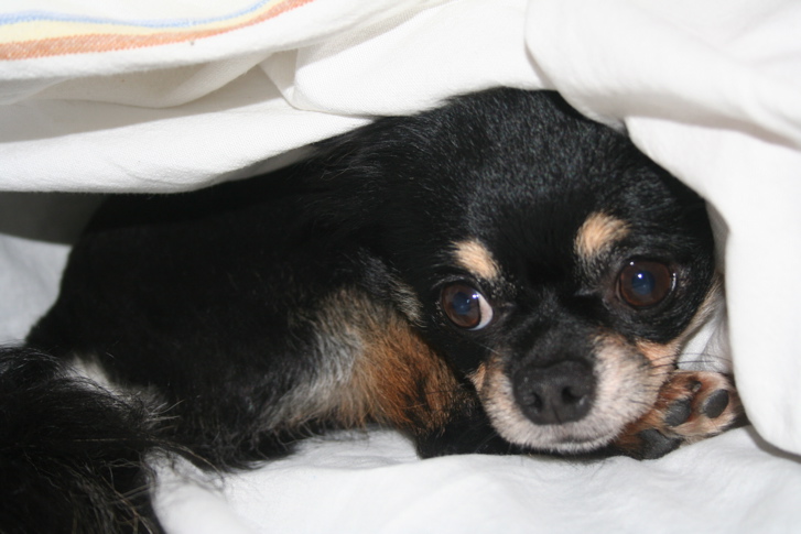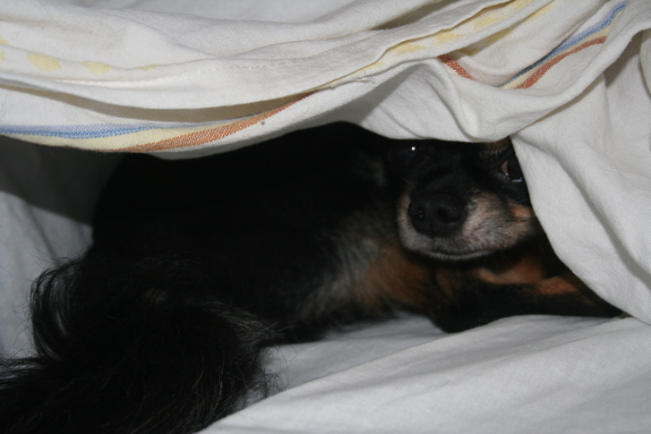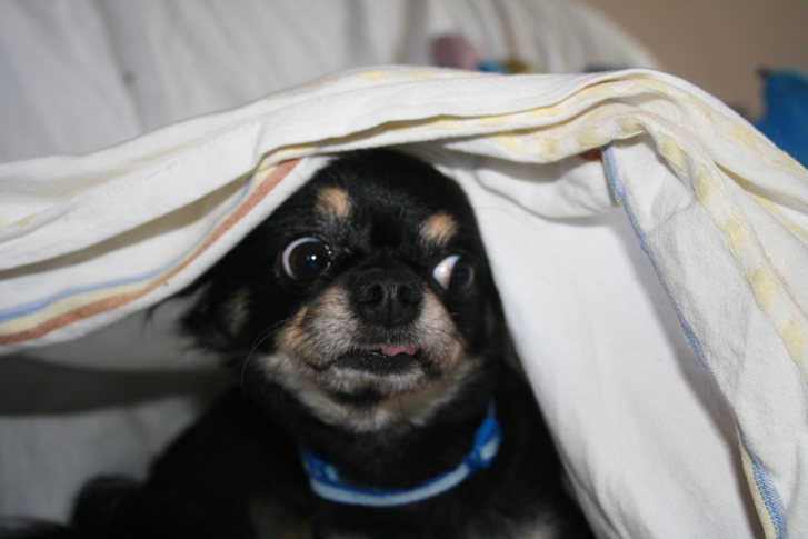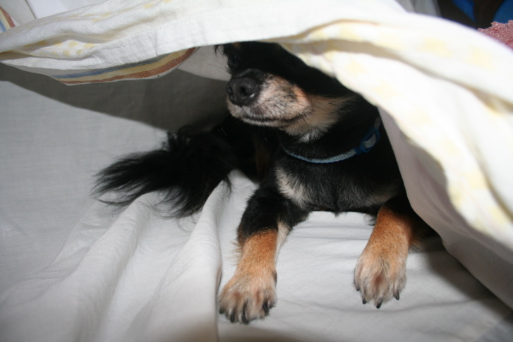 いたいた!!ソファにかけてる布の中に隠れてました。