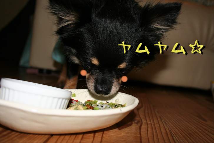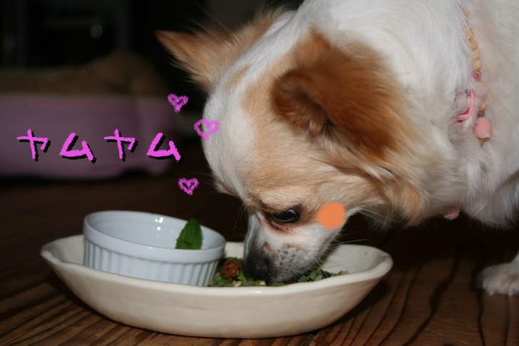 以前、フードのみで別のメーカーのフードを食べていた頃、カンチンは何かとおなかのトラブル(下痢になったり、便秘になったり)してて、コムは量的にはちゃんとあげているのに、空腹時の嘔吐がよくありました。涙やけも、手作りゴハンにすると良くなる事が多いようです。