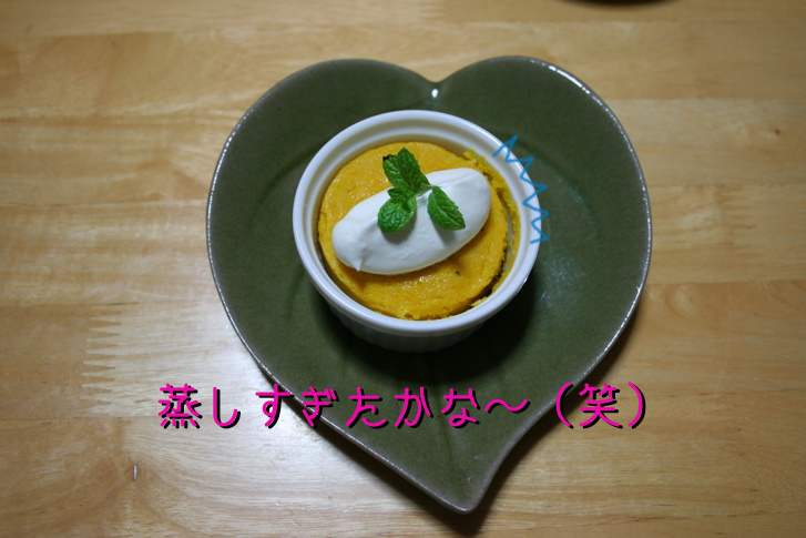 ワンコ用は低脂肪乳でいいのですが、おデブわんこ達なので、豆乳にしました〜(苦笑)カボチャの皮を取って、裏ごしして、豆乳は人肌に温めます。後はソレゾレをマゼマゼして蒸し器で蒸しただけです。