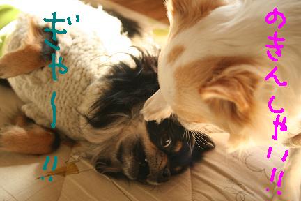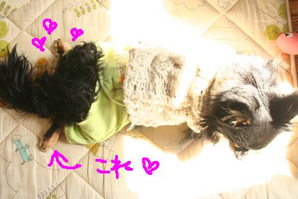 とばかりにガウガウ!しかし、膝の上にのぼってきて、甘えんぼポーズのお腹見せ・・・。