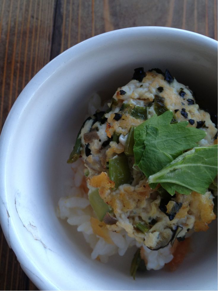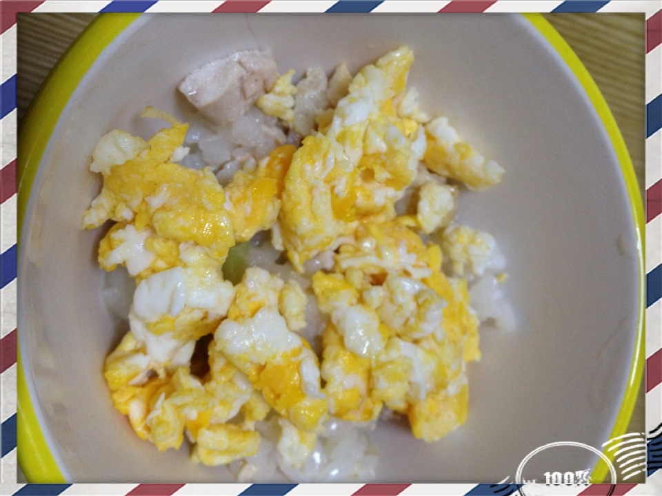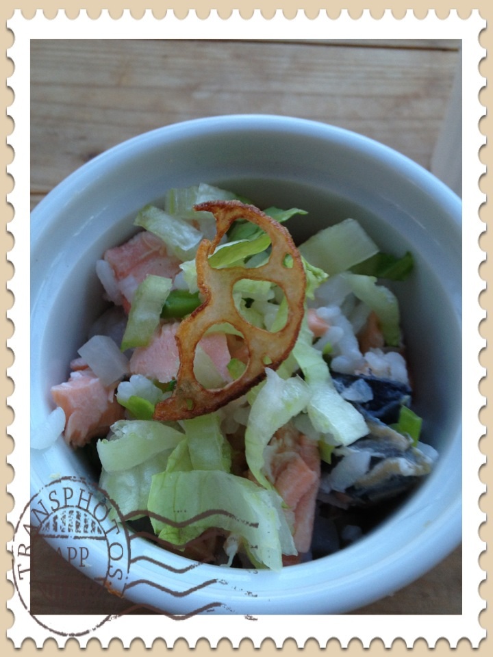 蕪、ブロッコリー、白菜入りのおじやに蒸した鮭を混ぜこんで。