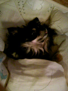 私の掌に顔を置いて熟睡するカンチン。動くに動けませんがな!