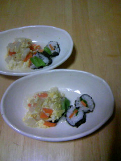 節分って事で、夜ゴハンは卵と野菜のスープに巻き寿司をつけてみました♪