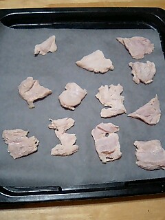 ところで、以前手作りワンコゴハンの本を見て気になっていたオヤツの中から、「ささみジャーキー」作ってみました。