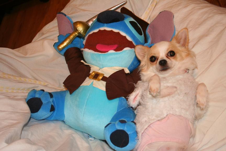 最近、コムチンはこのスティッチのぬいぐるみがお気に入りのようで、よく一緒に寝てます。う~ん、これまた夫婦の危機かっ?!(笑)
