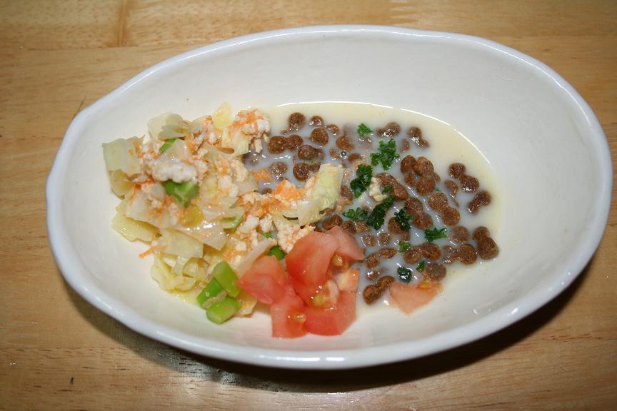 ドライフードの豆乳シチューがけ。トマト添え。キャベツと人参、少量の鶏ミンチを煮込んで、仕上げに豆乳を混ぜたものです。
