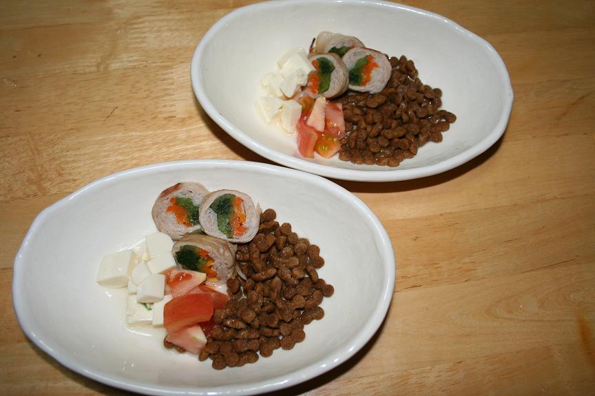 ドライフード&豚肉の野菜巻き。豆腐&トマト添え。私達の晩御飯が豚肉の野菜巻きだったので、ヒトツとっておきました。人間用はお醤油、お砂糖、ミリン、お酒、お酢で味付けしたのですが、カンコムのは、薄~くした鰹だしと一緒にレンジでチン!!その後毛艶を良くするオリーブオイル少量で焼き付けました。フードに残ったお出汁も少し回しかけて。この後小指大のリンゴまで食べました。う~んやっぱり食べ過ぎだよな~。今のところ、オヤツ的なものは全然あげてないんですけどね。もうちょっとちゃんとゴハンの事、勉強しなきゃなあと思いつつ、自身も食べ過ぎの初秋の夜なのでした。食欲の秋・・・この後どおなる?!