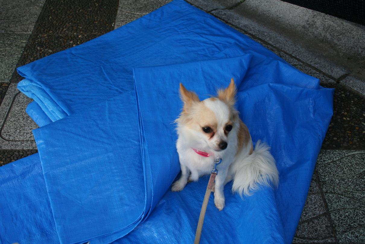 ちょっと落ち着いたところ・・・コムは地べたに決して座らず、tonoのブルーシートの上にちょこん。