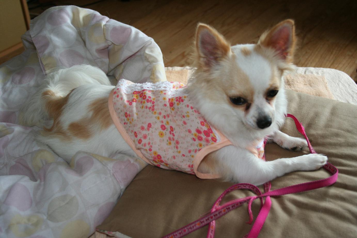 市販のチワワ用のお服は入らないので(泣)作りました。デッカクとも少しでも女の子らしく見えるような素材で。いかがでしょう??